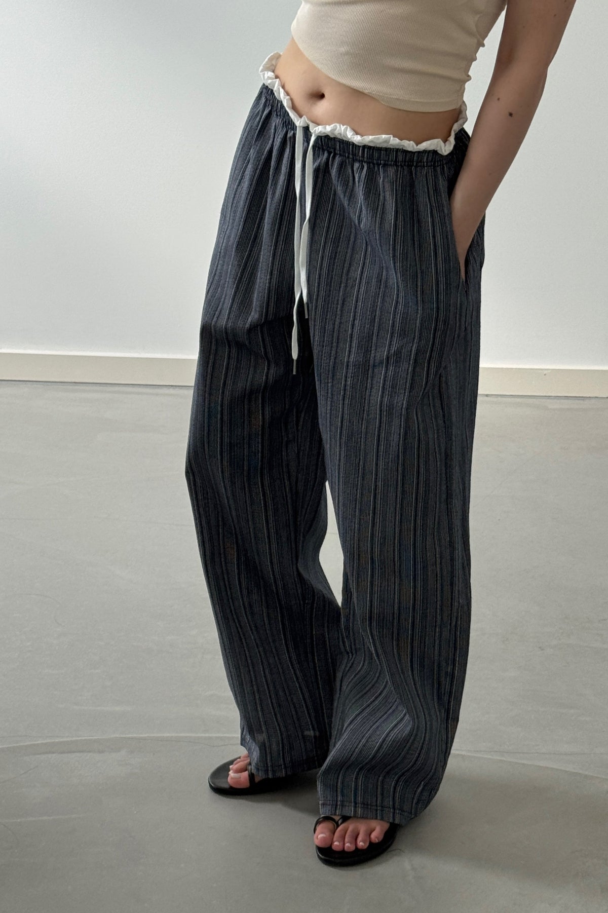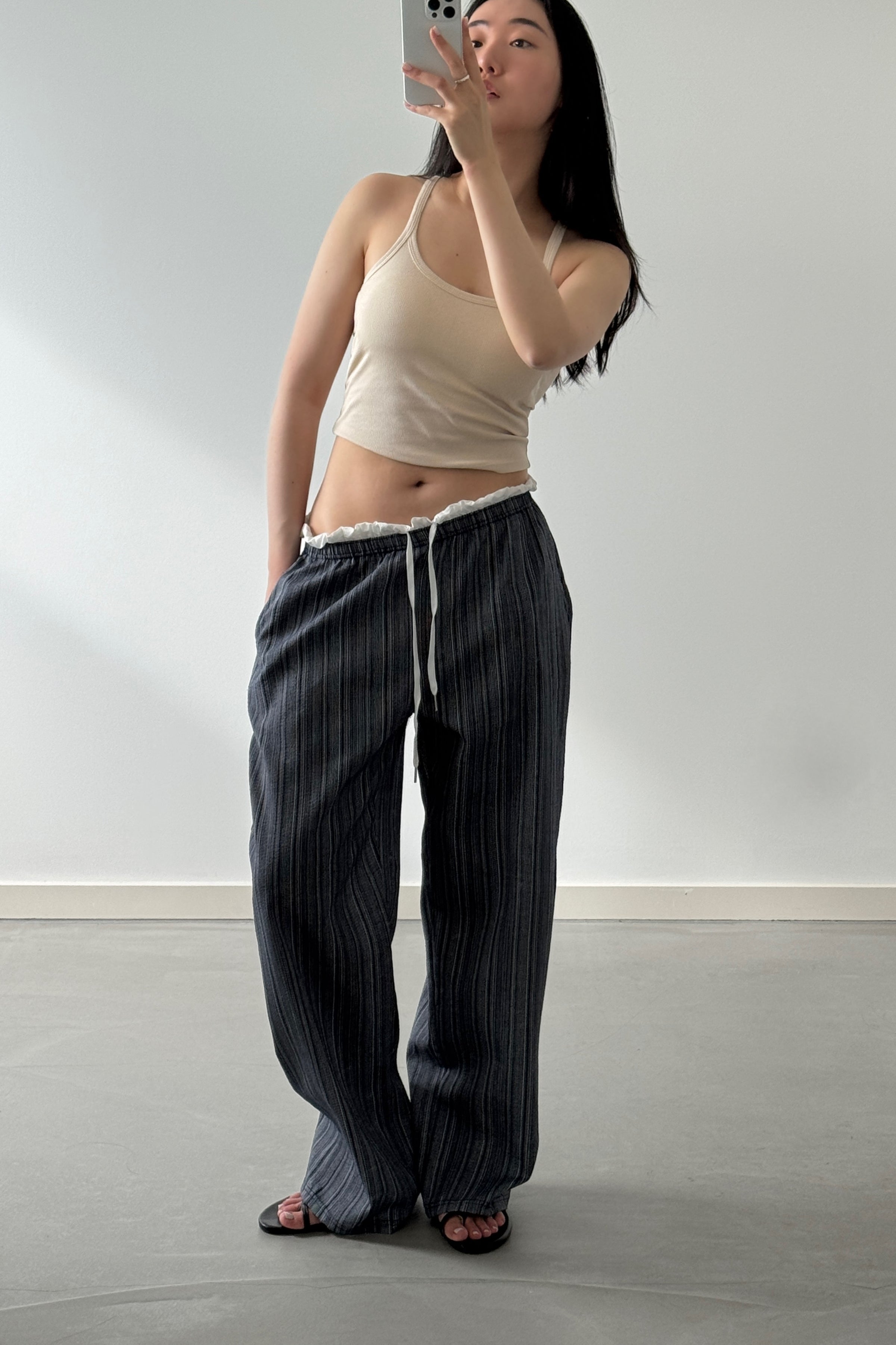 These wide-leg pants are crafted from a textured fabric that holds its shape, giving them a structured yet airy volume. The fine vertical stripes add subtle detail, while the elastic waistband with drawstring ensures a comfortable, adjustable fit. With their puffy, lightweight silhouette, these pants are perfect for casual styling in summer :)