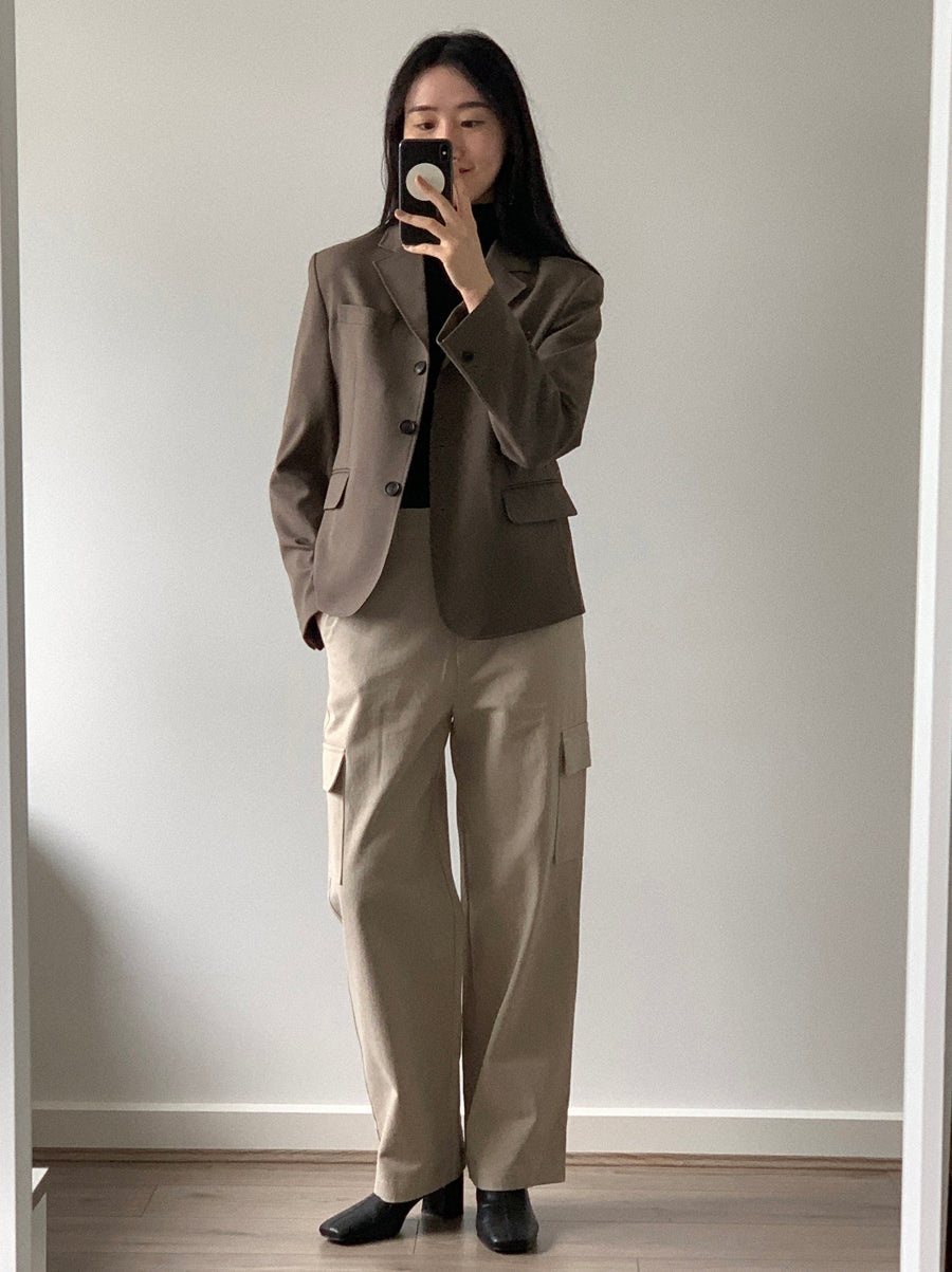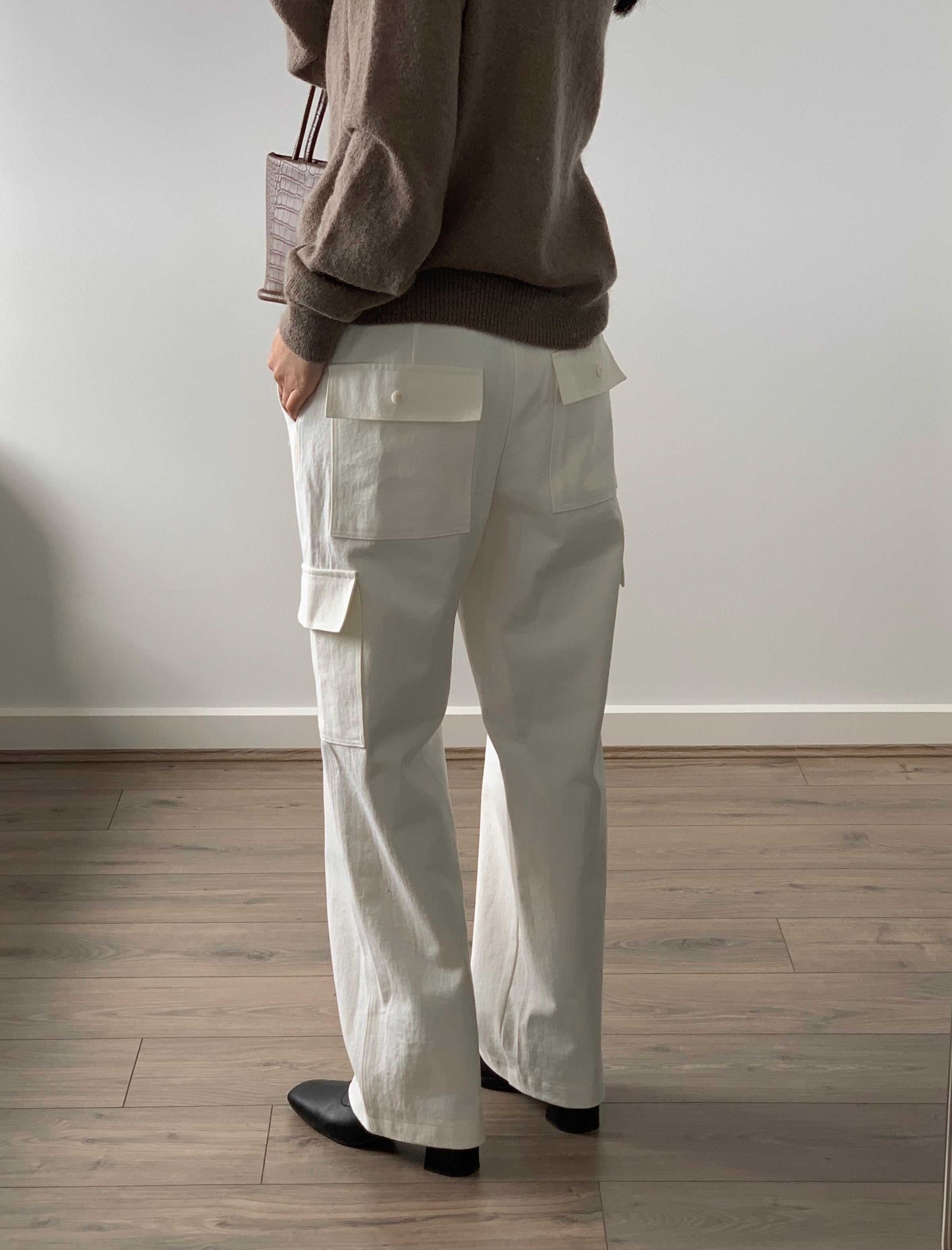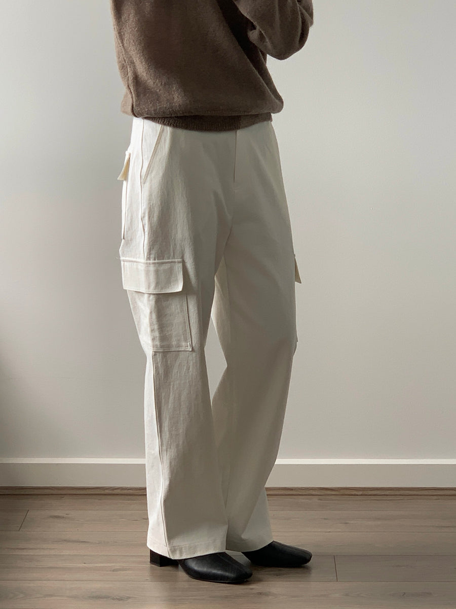 These durable slacks is made from high-density cotton and Japanese imported yarn, and features a relaxed straight fit (ideal for those who are concerned with their hip and thigh area), high waist, and pocket details. Goes well with a variety style of tops, such as a simple tee, sweatshirts, and knitwear.
