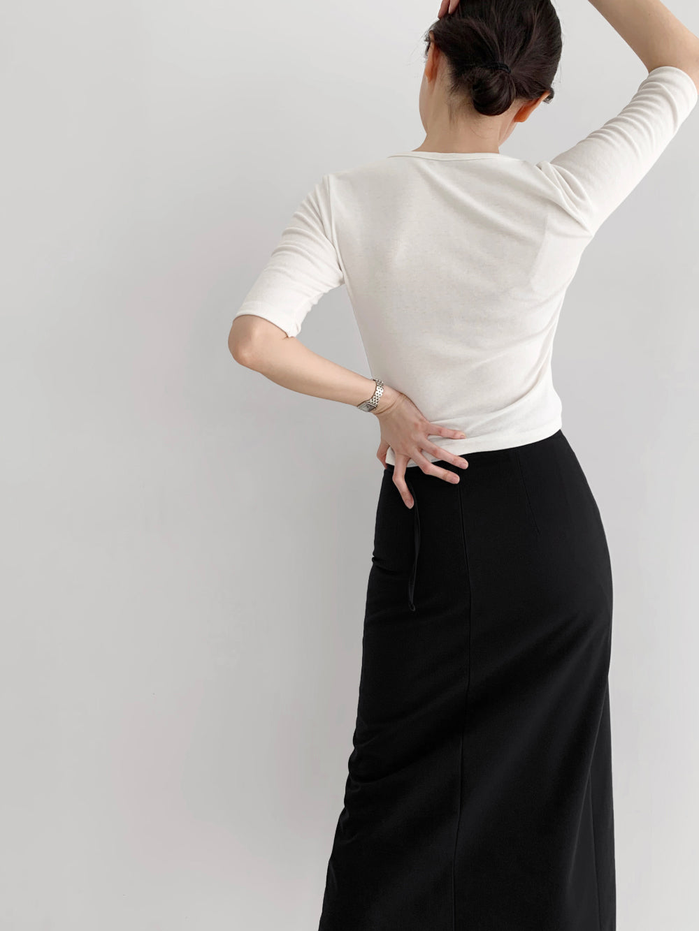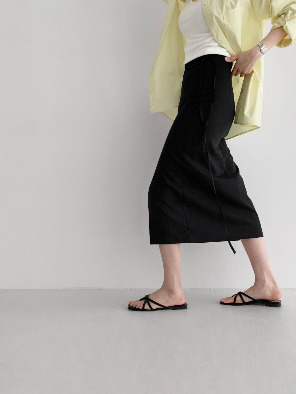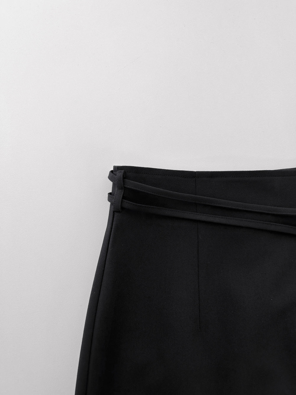 A feminine skirt that features a front slit and removable waist straps. We love the straight and slim fit that isn't too revealing, and the slit allows for free movement. The fabric feels smooth (resembling a suit), and the quality is even better in person.