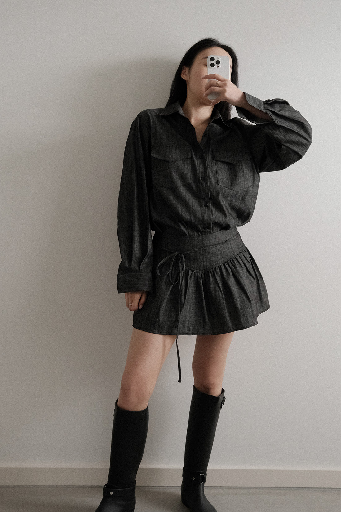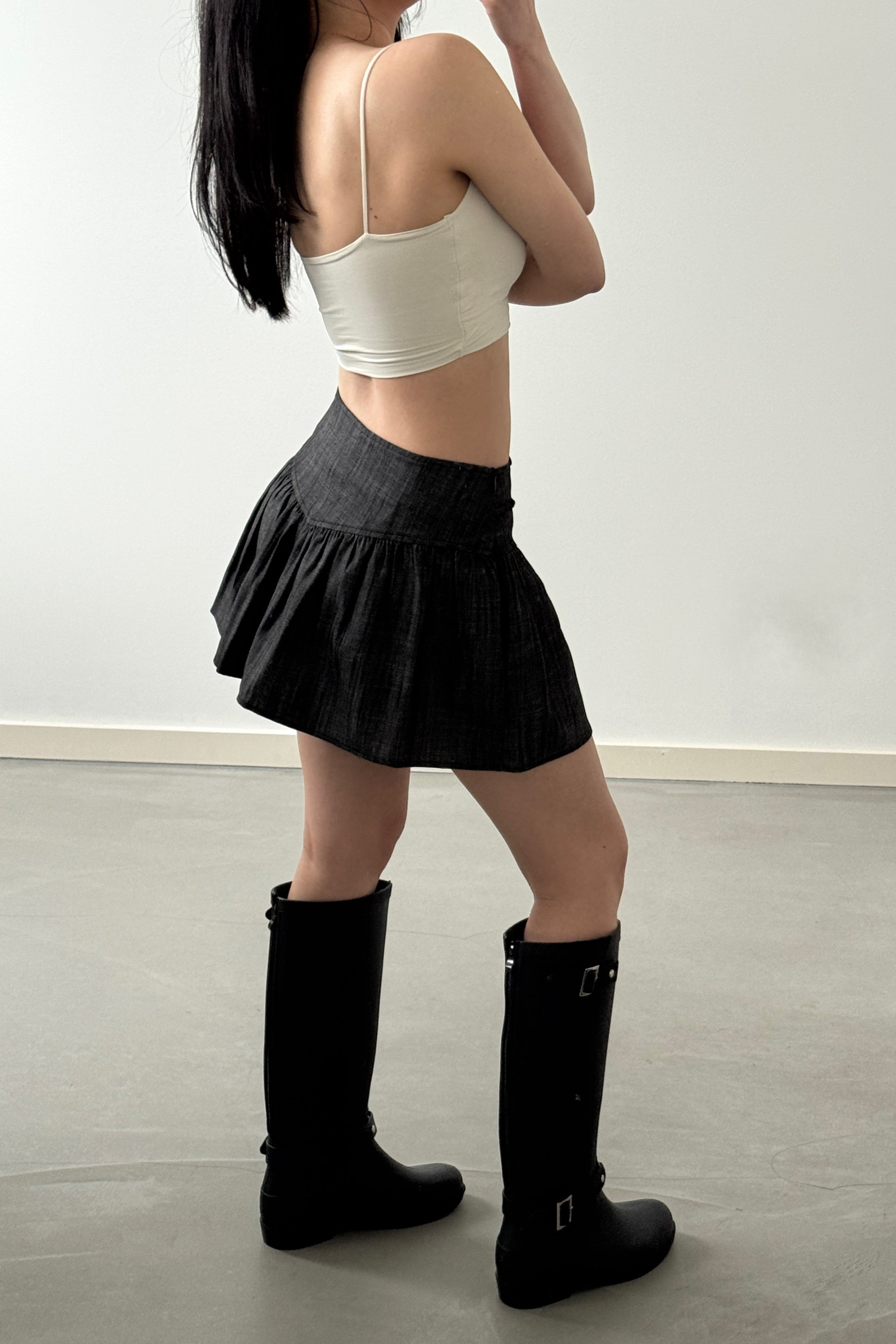 A playful mini skort that combines the ease of shorts with the feminine look of a skirt. Crafted from a structured denim-like fabric, it features a chic mid-to-low waist with decorative side ties. The gathered detailing creates soft volume, giving the hemline a flared effect. Although it's designed in a mini length, the short underneath allows you to wear it with confidence and comfort. Looks cute with oversized shirts, tailored jackets, or relaxed knits.