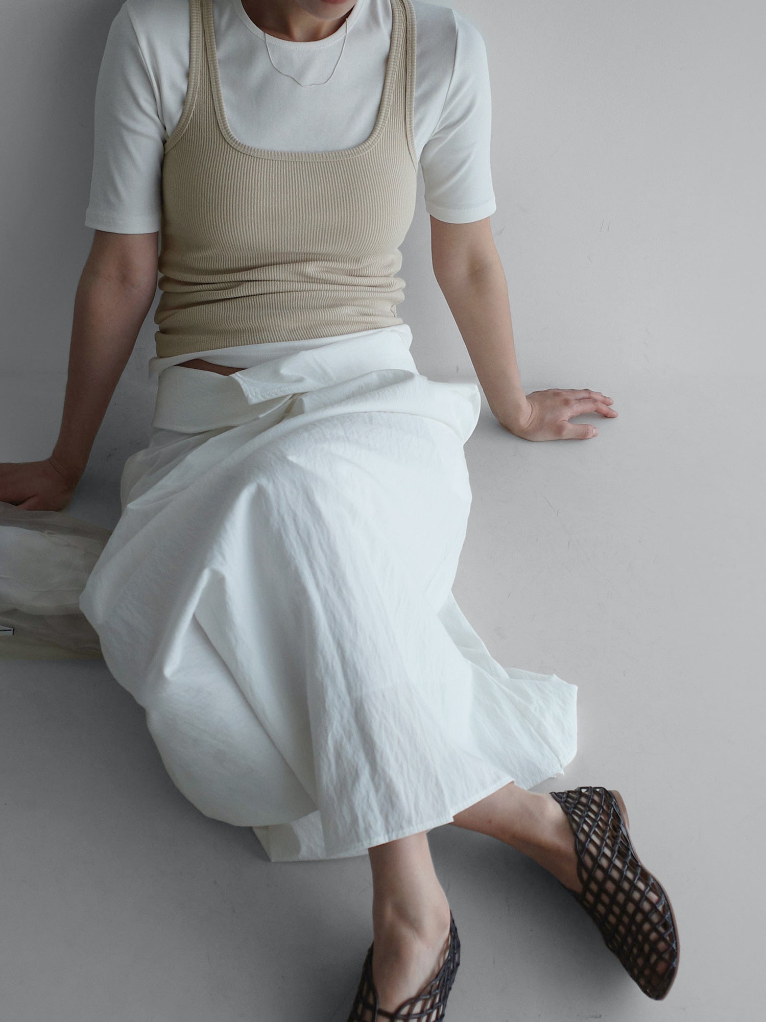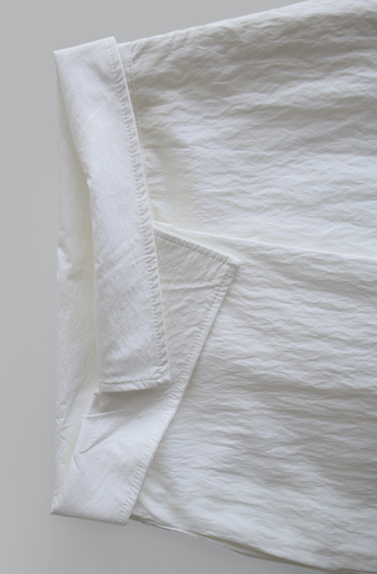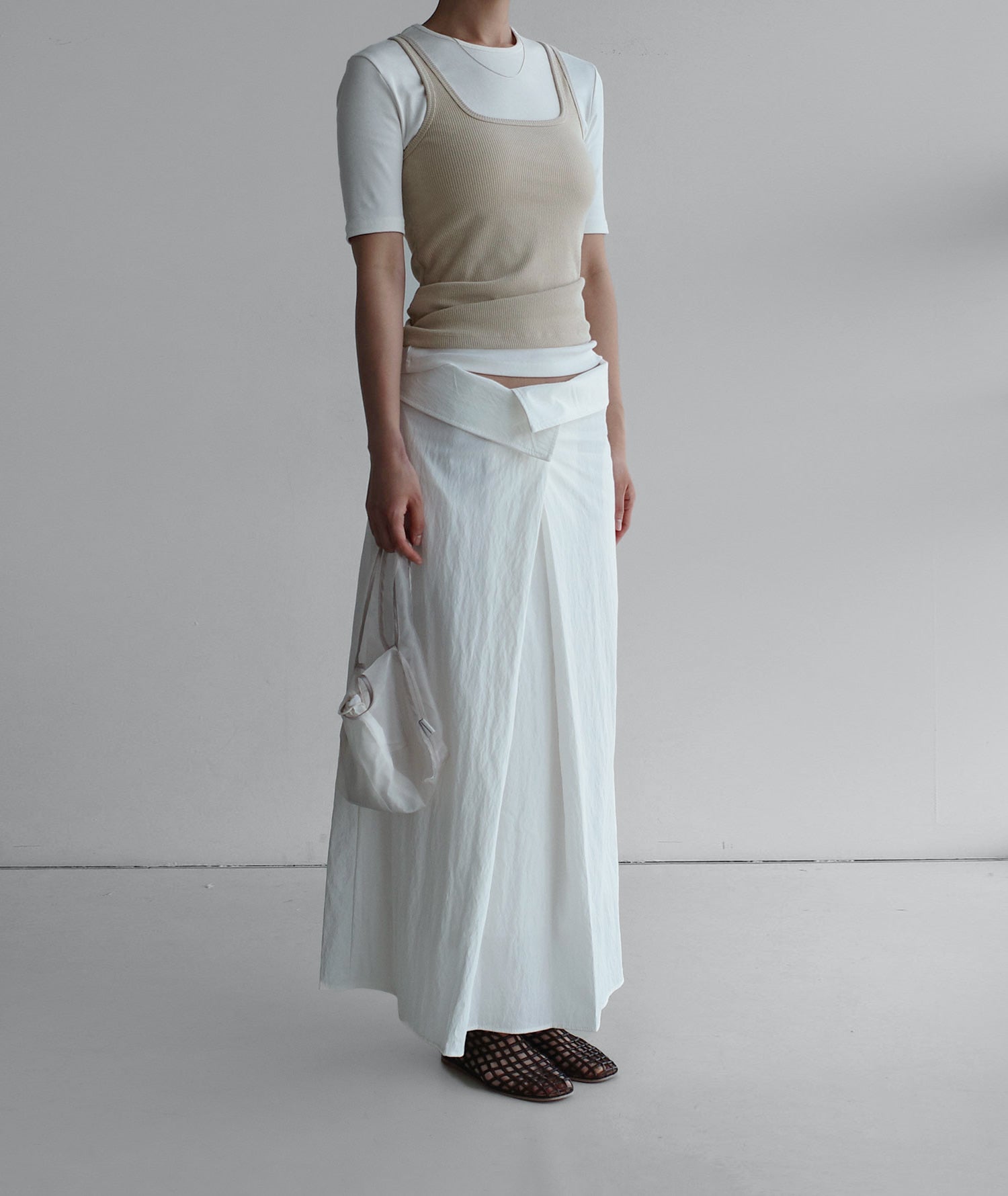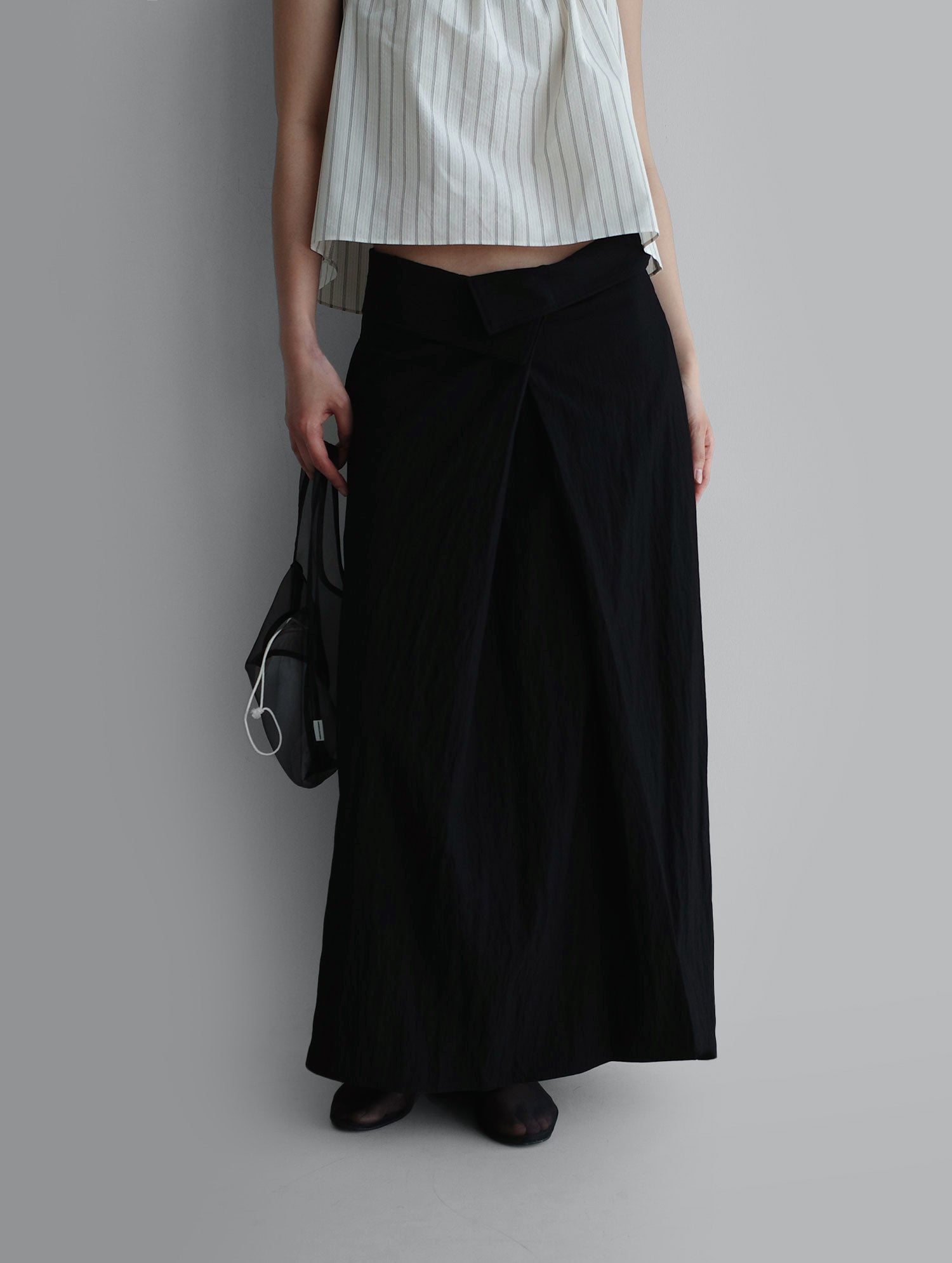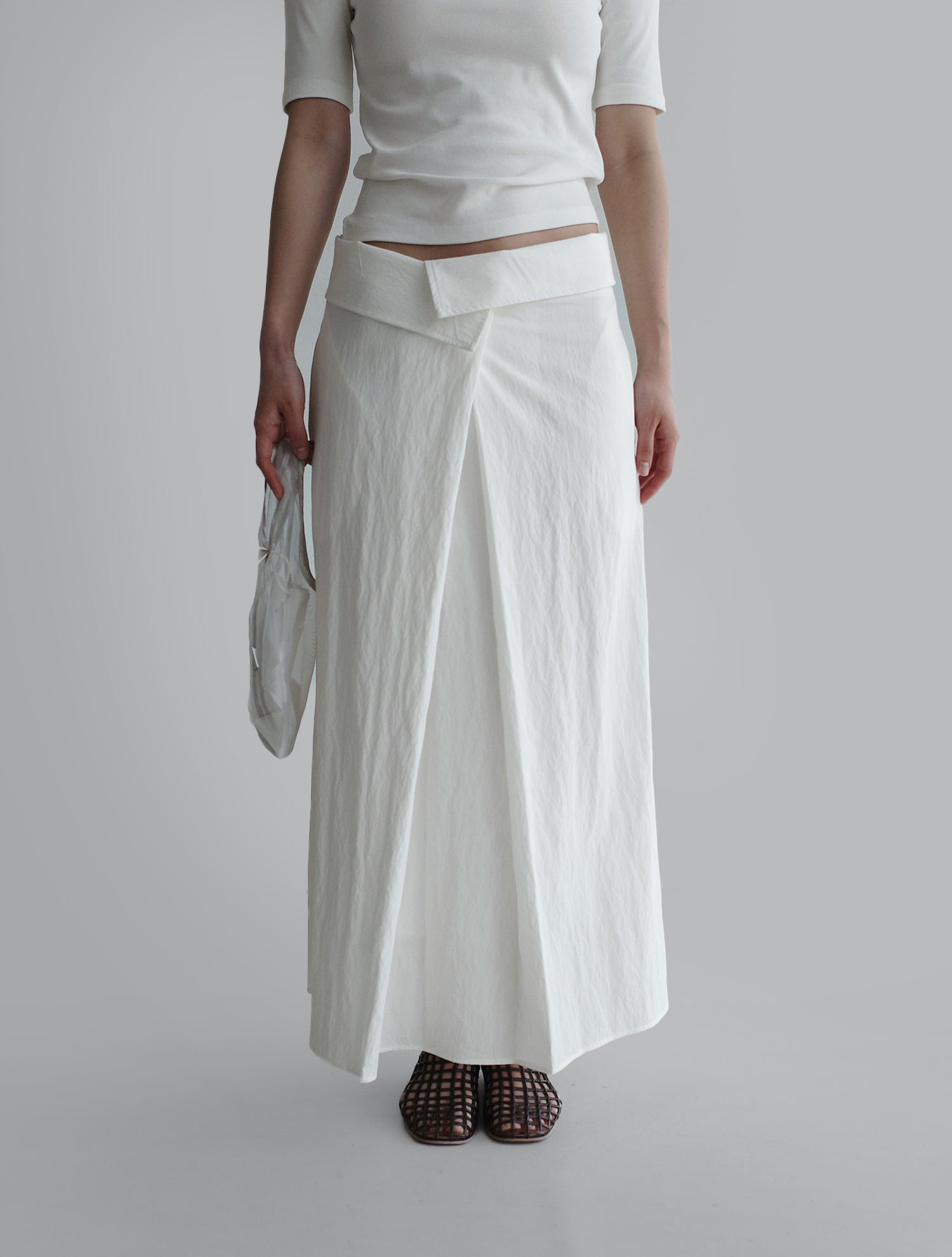 Designed with a wide fold-over waistband that creates a distinctive focal point, this piece features a wrap-inspired pleat line and a maxi, elegant length for a sophisticated look. The adjustable double-button detail at the waist allows for a flexible fit. Made from lightweight and crisp nylon with a smooth lining, it offers comfort even in the height of summer.