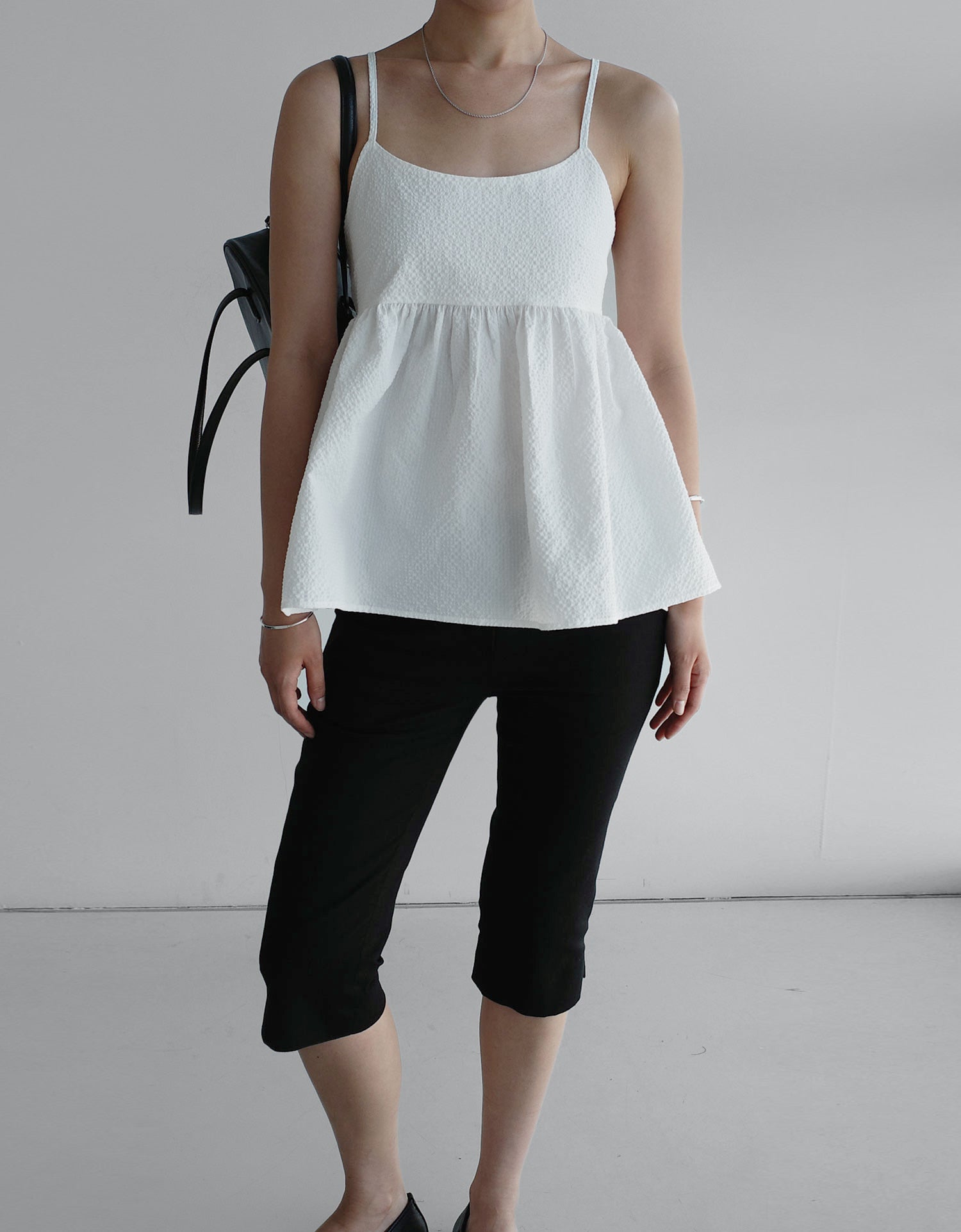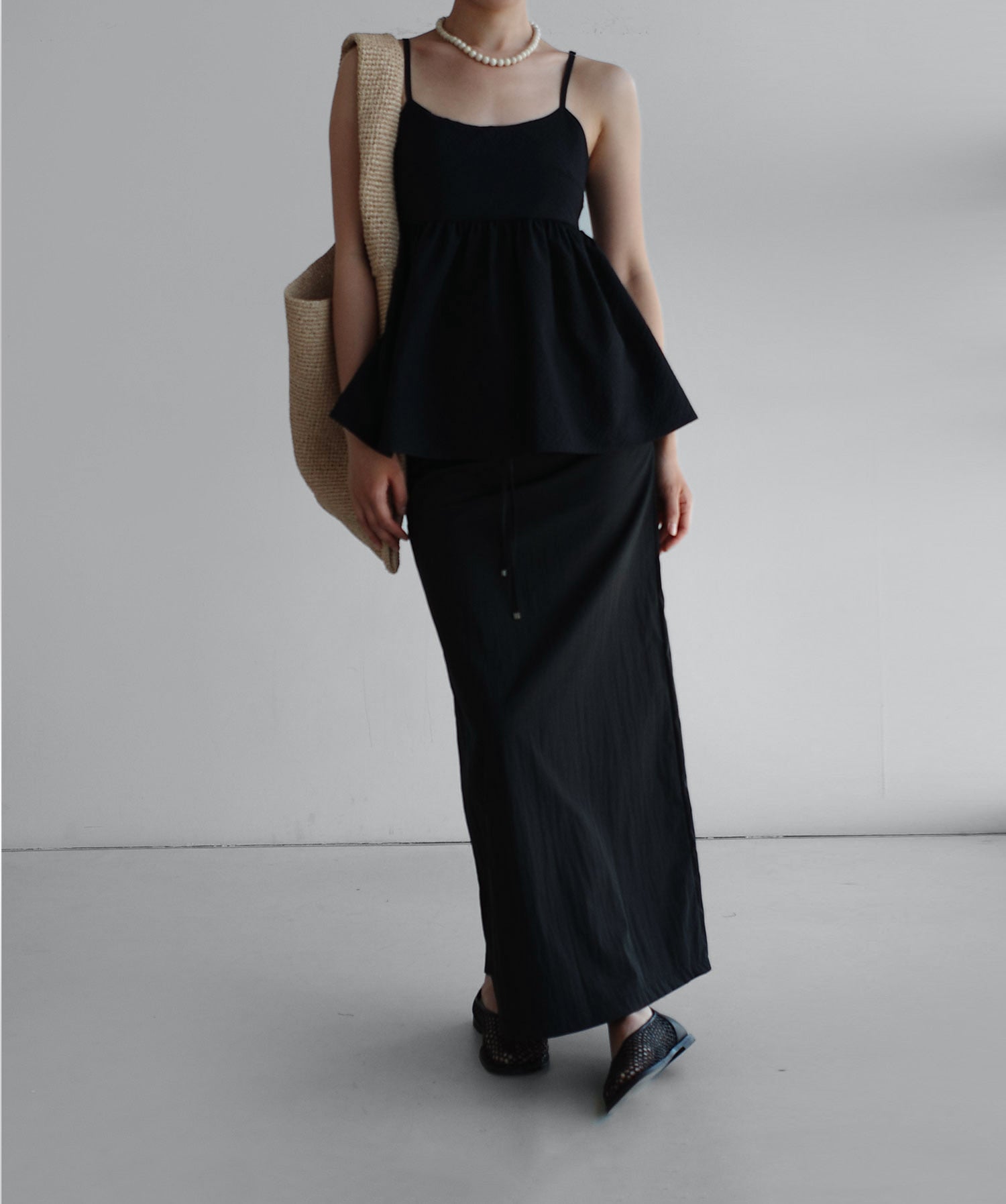 Crafted from seersucker fabric with a subtle embossed texture, it offers both a cool touch and a distinctive visual appeal. The clean front line and soft shirring below the seams create a gentle, flared silhouette that moves beautifully with the body. The open-back design features adjustable tie straps that can be styled to suit your mood, while the shoulder buckles allow for an easy fit adjustment.