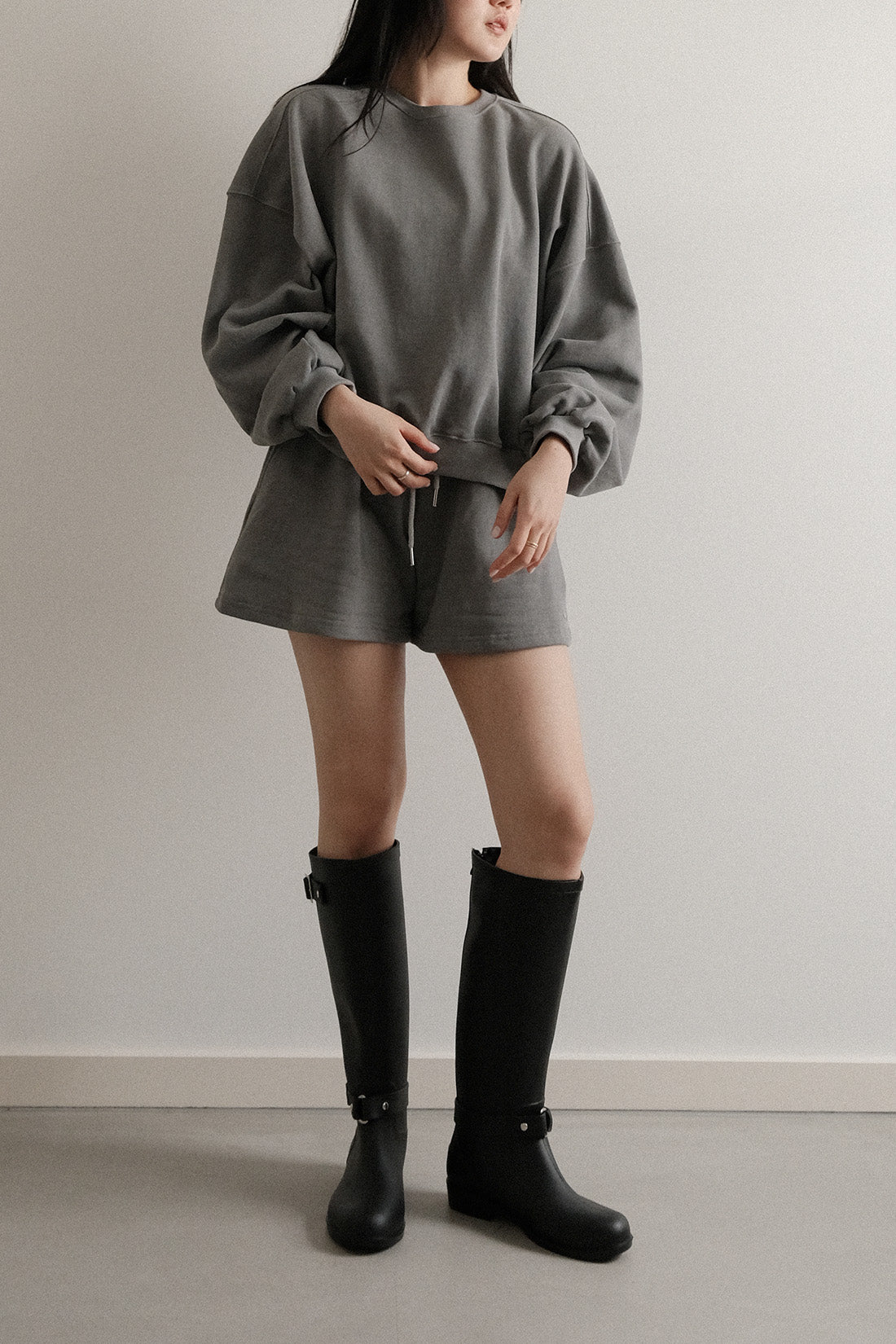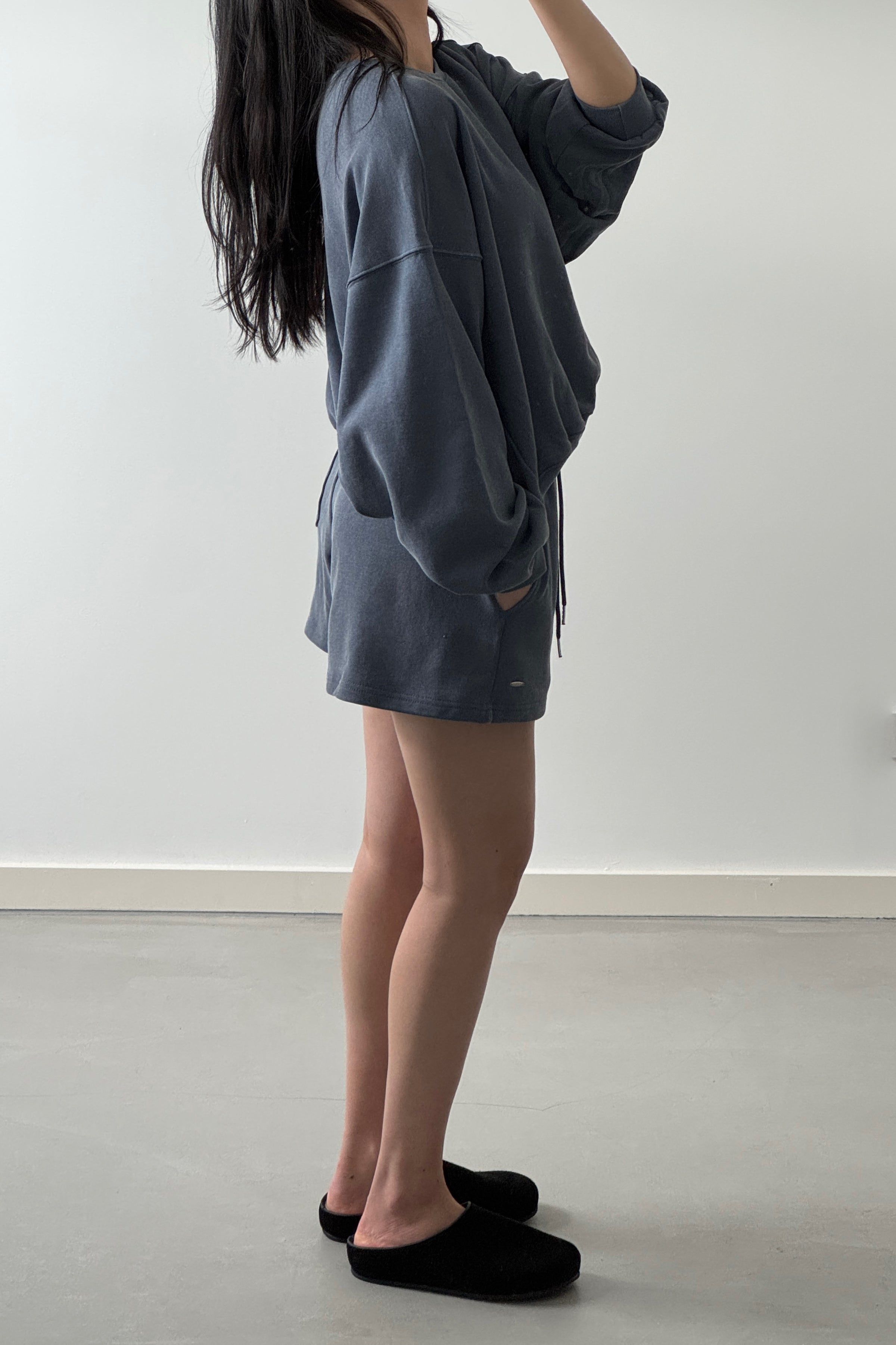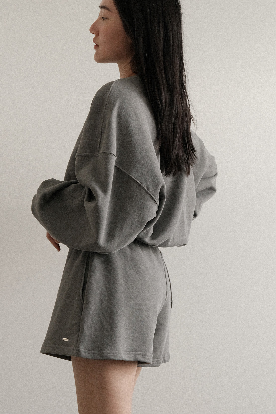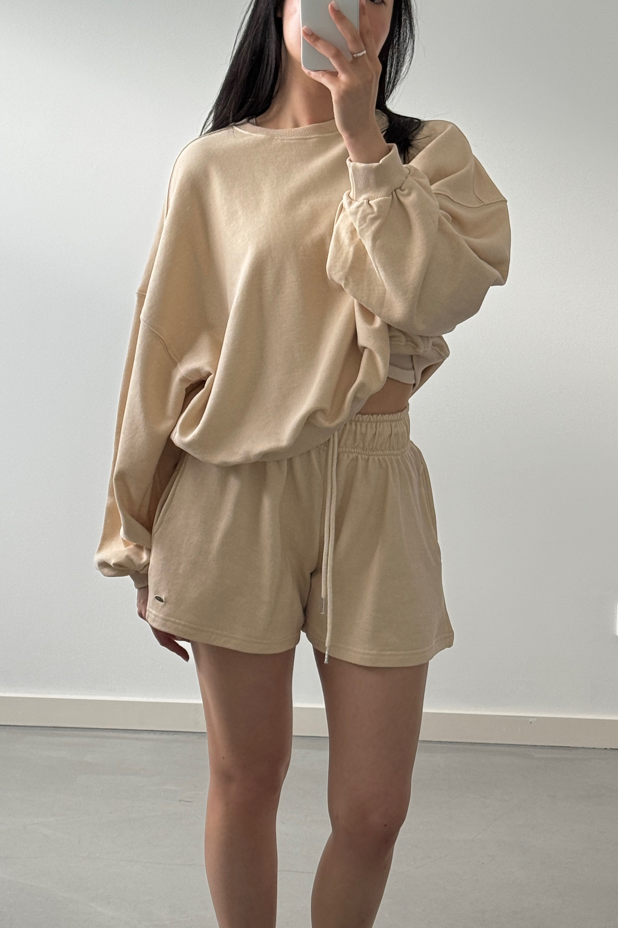 This retro oversized sweat set stands out with its muted, washed shades that give it a naturally lived-in, vintage feel. The sweatshirt, with its dropped shoulders and voluminous sleeves, pairs effortlessly with the relaxed drawstring shorts for a coordinated yet casual silhouette. Made from soft cotton, the fabric has been garment-washed to create subtle fading. Perfect for both lounging at home and stepping out in effortless style.