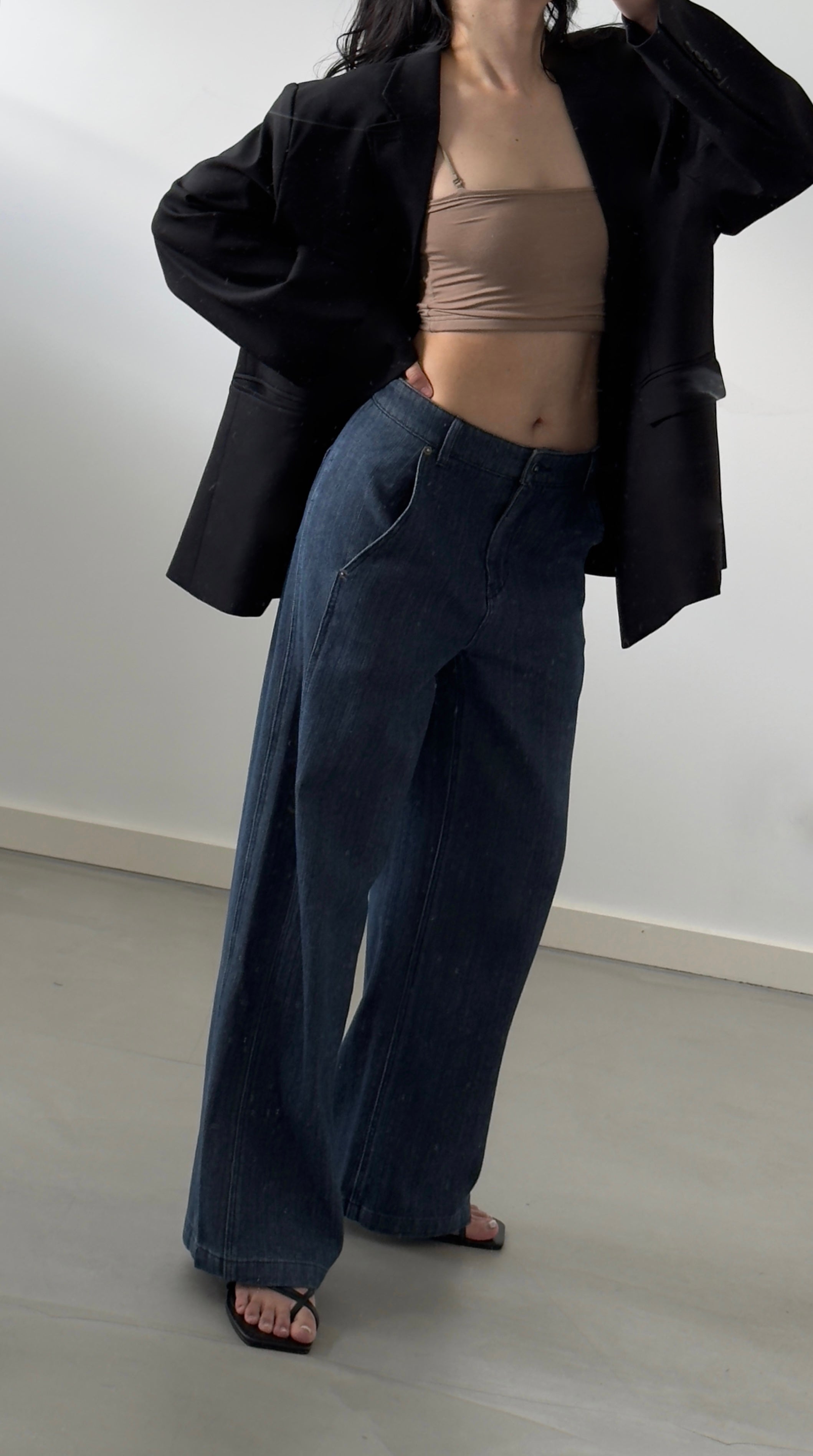 These denim trousers features a flared (-ish) and extremely flattering fit that sits just right at high-to-mid waist. We especially love the special texture and minimal waist.