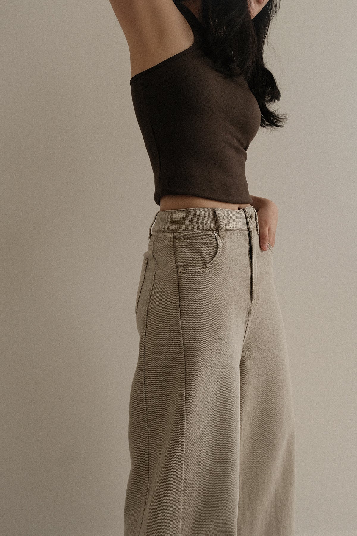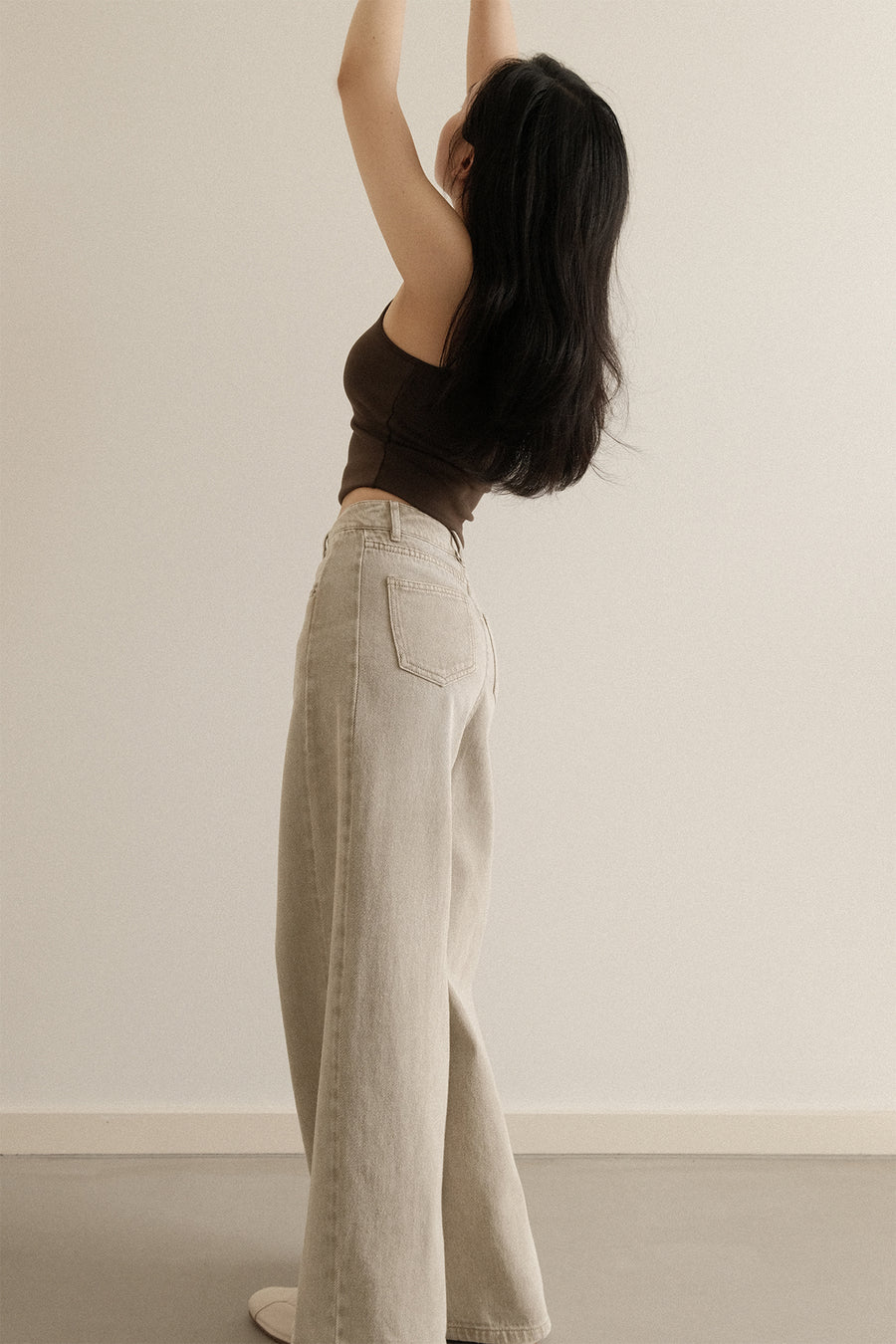 A pair of straight and wide leg jeans that is semi high waist, and can be worn all year round thanks to the thickness. We especially love the special faded khaki wash, twisted double side seam, and optional buttons at hem.